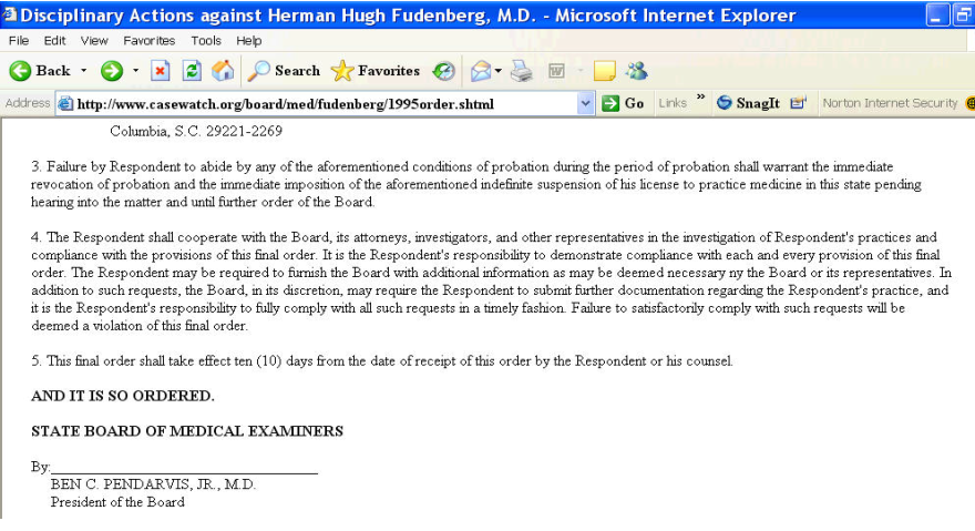 It is also interesting to read some of the "other headings" on this screenprint... those speak volumes too (note bottom right in the colored area...)! It states: " Consumers For Dental Choice Sues ADA. Dental safety group files an antitrust petition against the ADA for its threat to withdraw dental services from Maine if that state bans mercury fillings"... How very interesting indeed! Society had better start standing behind its doctors and dentists and start taking a stand against those who would propagate the lie that "mercury is safe"... clearly the FDA and government agencies such as the military knows it isn't per that docket and "hazardous materials info" referenced above! Who will Quackwatch and "the administration" go after next? IAOMT? The US Army? Dr. Boyd Haley, metals expert who testifies in vaccine hearings that no amount of mercury is safe in the human body? Note that Boyd Haley has spent his life studying metals... I think he too knows a little something when he says mercury and aluminum are not safe substances to have in vaccines... just as I very much believe Dr. Andrew Wakefield - another person who has exposed the truth at great personal cost - knows what he is talking about when he raises his concerns about the MMR (read more on the MMR in the paper on Redefining The Role Of Insulin, and Book 3 , both posted in full on this website... this vaccine has no mercury in it... but it does have 3 live viruses.. viruses that grow, thrive and multiply... on iron... and both viruses and iron - which impacts insulin levels - are also very much being linked to mental illness... note that prenatal vitamins are LOADED with iron)! So... let's see... who to believe... those at the Failing In Duties Administration [who see no need to inform consumers of the dangers of dental amalgam in spite of admitting to the toxicity of mercury] or those at the CDC, an organization that appeared to find even Common Disorders Confusing, and Customarily Disregarded Critics as it chose to Conceal Data Controversies and Casually Discard the Critical [you just have to take the time to read those transcripts folks... they are just simply too revealing when it comes to matters of "expertise" at the FDA/CDC/pHARMaceutical industry!]... ... I guess those at "Casewatch" and "Quackwatch" didn't read those transcripts either... in my opinion, it looks like they are "a little behind the times" in their research as to what really constitutes "quackery" and or "substandard practices" in health issues... Sadly... If you tell a lie long enough, loud enough and often enough, the people will believe it. Adolf Hitler at least to a point... and there is a whole lot of lying going on folks... luckily... many of us are now seeing that! So... to scientists who have the courage to stand for the truth... keep doing what you are doing... your efforts are not in vain... you are helping to save lives... and parents are listening and respect what you have to say... and they will vote out politicians who continue to lie about these issues... doing what is morally correct is more important than doing what is politically correct or "easiest for me"... justice is coming. "FIRST DO NO HARM"... doctors and/or scientists raising these concerns are truly to be admired for their courage! How "interesting" that this "order" on Dr. Fudenberg, dating back to 1995 was only posted on this website 10 YEARS LATER... Do I see "an agenda" at play here as the battle over mercury heats up all over the world? You bet I do! ... of course, maybe those who posted this are just "kinda slow" in "cluing in"... that would mean the folks who post this may have indeed taken 10 years to "find this"... I wonder how long it will then take them to "get a clue" as to all these issues... if this is indeed "indicative of their expertise" and "timeliness in informing the public". Guess I'll have to check back with them in another 10 years or so... So very totally LOL! :o)