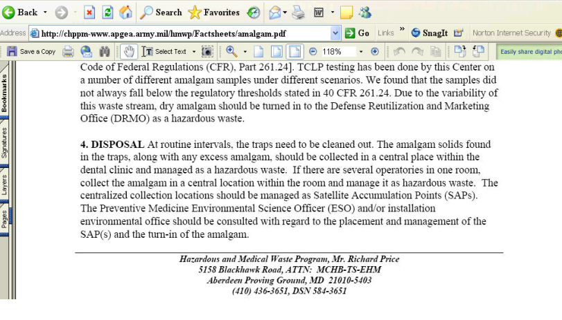 The above screenprint is taken from: http://chppm-www.apgea.army.mil/hmwp/ To read a whole lot more about the issue of the danger of dental amalgam and lies in dentistry, an online book by Ernie Mezei, entitled "Tooth Traitors", posted at http://www.vimy-dentistry.com/tttoc.htm explains many of the issues when it comes to the dangers of this dental material and mercury overall. The following screenprint is taken from the website of the IAOMT and provides a picture (left) of a tooth that was extracted over 25 years ago... note the mercury fumes still coming out of it after 25 years (mercury can potentially leak like this for up to 40-50 years according to some). The picture on the right is for a study showing neurons shrink to about 1/2 their original size within about 40 minutes after exposure to mercury. You can view/order these videos/presentations/pictures by going to the site of the International Academy of Oral Medicine and Toxicology (IAOMT) at: http://www.iaomt.org/ (guess this is just another one of those things those at "Quackwatch", the FDA, CDC, and pHARMaceutical industry "missed" in their "expert study" and/or disclosure of these issues... I strongly recommend everyone take the time to go to this website and view these short presentations... they speak volumes! This site also provides information on safe removal of dental amalgams and a list of mercury free dentists!