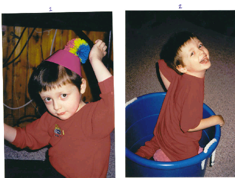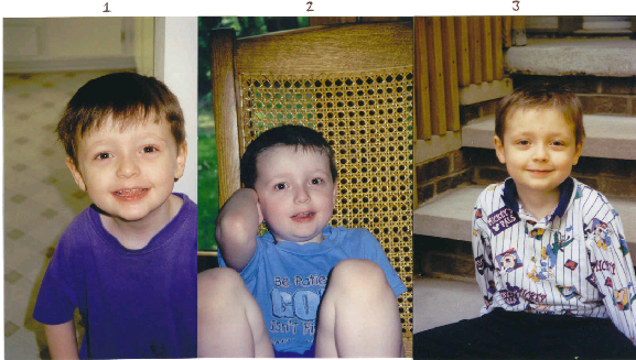 Picture 1: Zachary after renovating of our home in Illinois. This picture was taken after a complete overhaul of our home...there were up to five teams of various contractors at our home for close to 3 weeks...Zachary had no routine whatsoever...he was fascinated by all the activity...and he thrived more than ever! We literally had packed all our belongings (to move) and lived in our basement for 3 weeks. Our entire home was repainted, all carpeting on two floors replaced, all windows washed, our double deck power washed and stained, all squeaks were removed from floors, the entire kitchen sub-flooring and linoleum replaced, etc. In addition, people were constantly coming over to "view our home" for close to a month. Again, in spite of the total lack of routine, and disruption in our "daily lives", Zachary absolutely thrived! Picture 2: Zachary in his "Be Patient...God Isn't Finished With Me Yet" t-shirt (my favorite). This was the shirt he was wearing when he broke his arm in June 2001...the doctors had to cut it to pieces to get it off. :o( Picture 3: Zachary on his 4th birthday (August 12, 2001). Again, note alertness and lack of red cheeks/ears...overall, a much happier child!