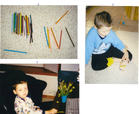 Zachary is much better about not having to align all his pencils...he still likes to stack things (picture 2), but can cope much better when they "tip over". In picture 3, Zachary is at his computer. What is important in this picture is the small bouquet of flowers. This was the first time Zachary actually kept the flowers "intact" for a short period of time. Prior to this, he always ripped the flowers off the stems and made a stack of flowers and a stack of stems...to him, that was order. Approximately 10 minutes after this picture was taken, the flowers were "pulled apart" from their stems... but, at least, this time, it had taken 10 minutes... progress...slowly, but surely!