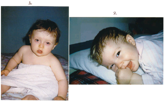 Note how Zachary looks "drugged" whereas Anika is happy and alert.  Zachary's cheeks are not red here because I had been given a prescription to "take away the red"... a "face mask ointment" as I called it...hiding a deep, very serious, underlying problem.  Note that Zachary has dark, almost purple bags under his eyes...another sign of a food intolerance!  This picture of Zachary was taken right after a bath...a time at which children usually feel their very best.